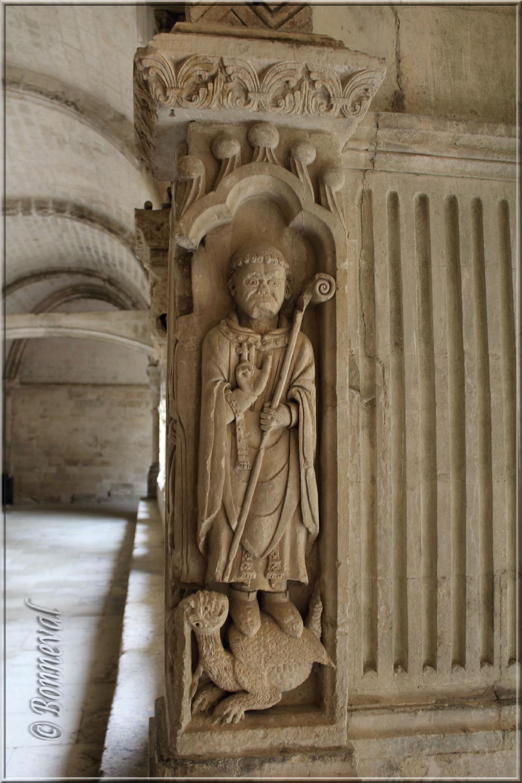Sur la face Nord, le commanditaire du cloître Guillaume de Bonnieux (1204-1234), bénissant de deux doigts levés de sa main droite, tenant sa crosse de la main gauche et écrasant un dragon sous ses pieds ;